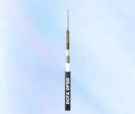 DCFA 光纜的結構是將 250μm 光纖套入高模量材料制成的松套管中,松套管內放入特種阻水紗對光纖進行關鍵性保護。纜芯的中心是一根非金屬加強芯(FRP),松套管(和填充繩) 圍繞中心加強芯絞合成緊湊和圓形的纜芯。松套管及加強芯外均設有阻水紗,纜芯上縱包阻水帶,進行涂塑鋁帶(APL)縱包后,擠制聚乙烯護套成纜。